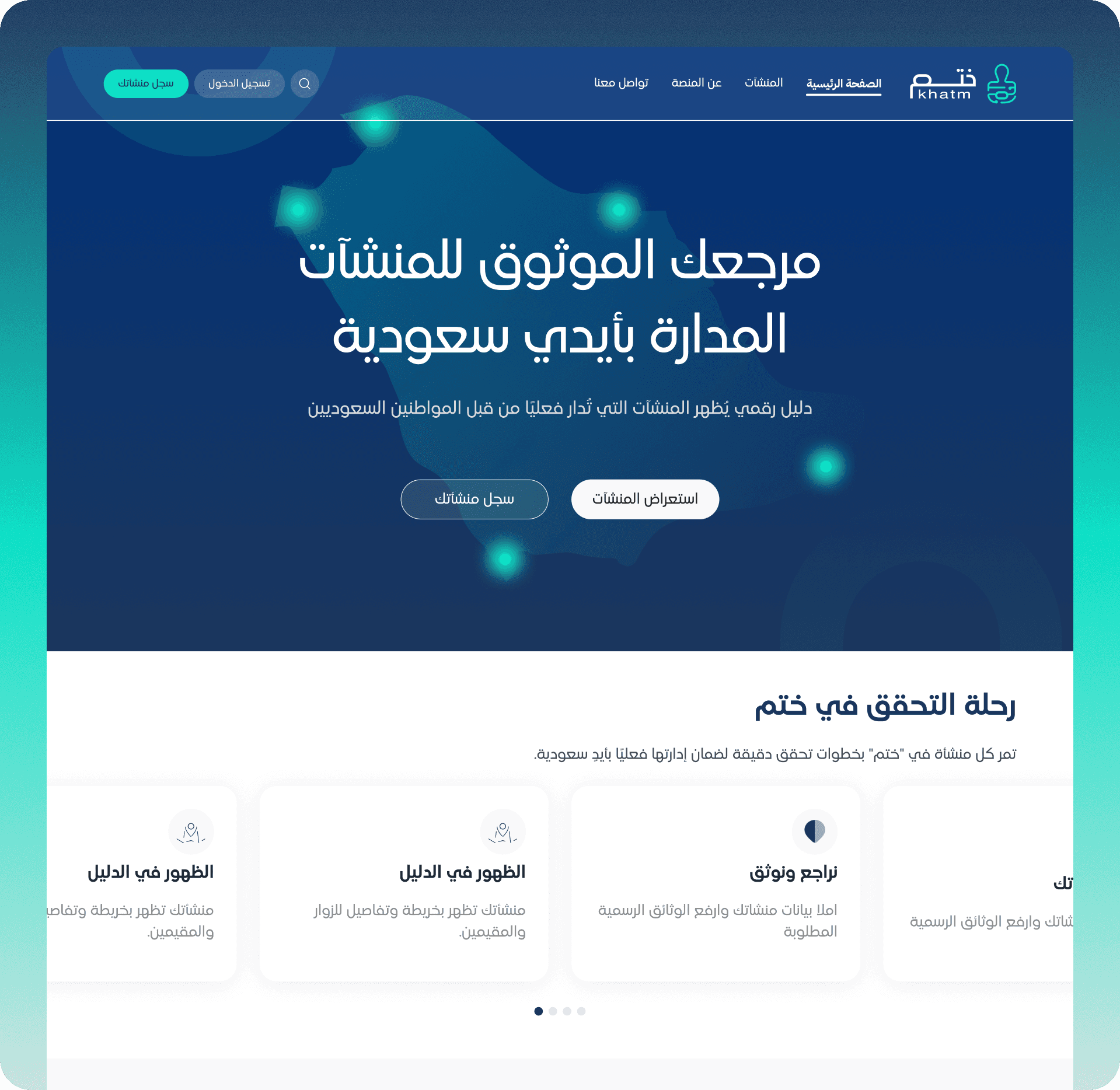 Khatm is a government-supported digital platform designed to act as a trusted reference for establishments that are genuinely managed by Saudi citizens. The platform also enables authorized government employees to issue and manage digital seals and official registration certificates, ensuring authenticity, institutional identity, and secure documentation.